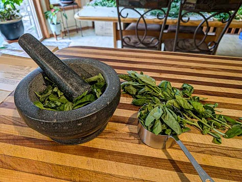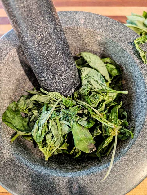 1 cup basil leaves + 2 cloves garlic + 1/4 tsp chili flakes + 1 1/2 cups white wine vinegar