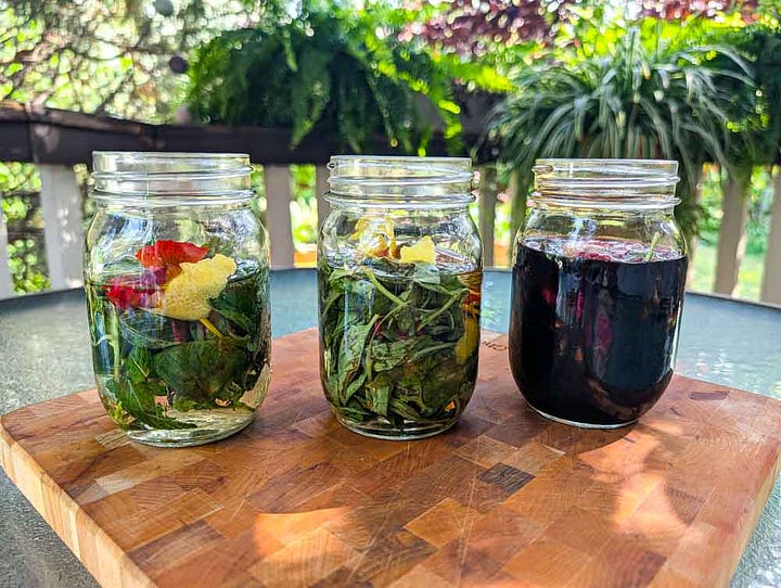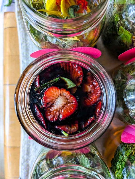 One way I've been capturing this summer’s abundance is with vinegar infusions to create dressings for salads and sauces for roasted vegetables that are more nutritious and contain less oil. I’ve discovered that the possibilities are endless. Pairing these infusions with dressings made from nuts and seeds, or nut or seed butters instead of calorie-rich oils has helped me stretch my salad dressing skills in ways I’ve never explored before.