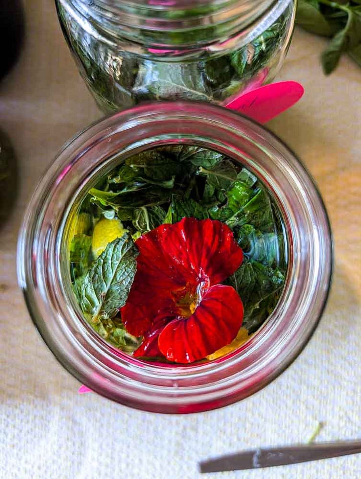 1/4 cup mint leaves + 1/4 cup basil leaves + 1 nasturtium blossom + 1 strip lemon zest + 1 1/2 cups white wine vinegar (pictured above)
